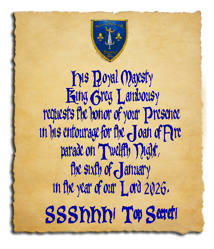 In recognition of his contribution to New Orleans and beyond as a community leader through his work as the director of the New Orleans Jazz Museum, and most especially for his work on building the jazz partnership with sister city Orléans, France, the Krewe de Jeanne d’Arc has named Greg Lambousy to portray King Charles VII in its 2026 parade. SSSHHHH! The identity of the king is a secret until his coronation party on Monday, Dec. 15th. King Greg has invited you to be part of his special day, and his messenger awaits your reply. Members of the King’s Entourage will need to provide their own costumes appropriate for medieval nobility and their own throws — 50-100 throws are suggested to supplement what King Greg gives you. Entourage members may purchase throws from us, make their own throws, or buy appropriate throws elsewhere according to our guidelines. Lineup is at 6:30 p.m. at the French Market vendor parking lot at 90 French Market Place.