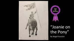 - Abigail Duvoisin, “Joanie on the Pony”: Charcoal pencil drawing on paper.